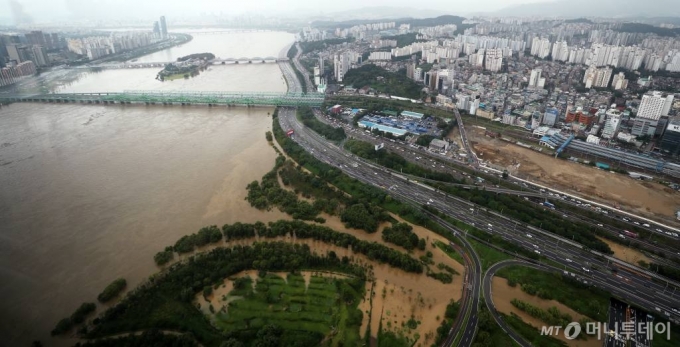 서울, 경기와 강원, 충청, 경북북부에 호우경보와 주의보가 내려진 3일 오후 한강 수위 상승으로 서울 여의도 63빌딩 전망대에서 바라본 올림픽대로 일부 구간이 통제되고 있다. / 사진=김휘선 기자 hwijpg@ |