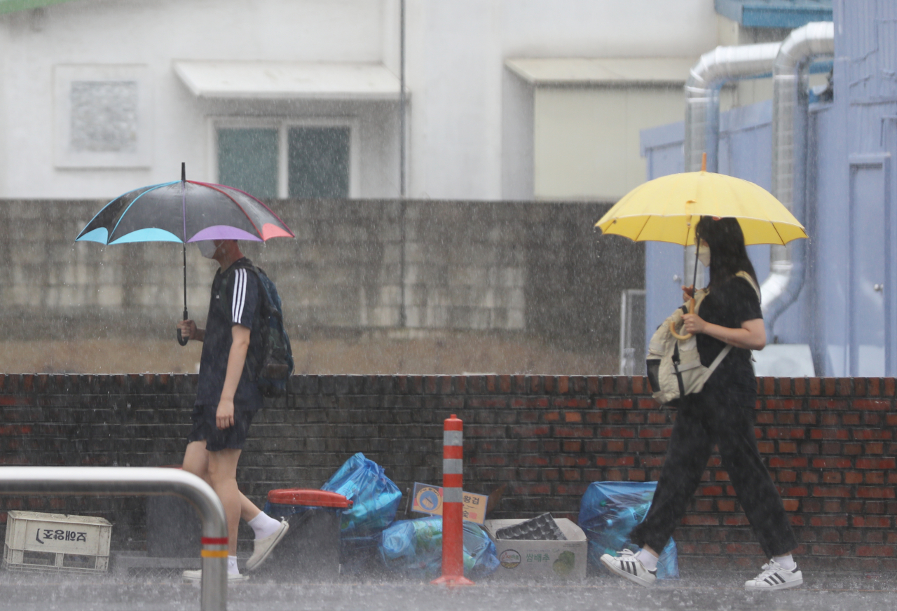 학생들이 세차게 내리는 비를 맞으며 등교하고 있다. [연합] |