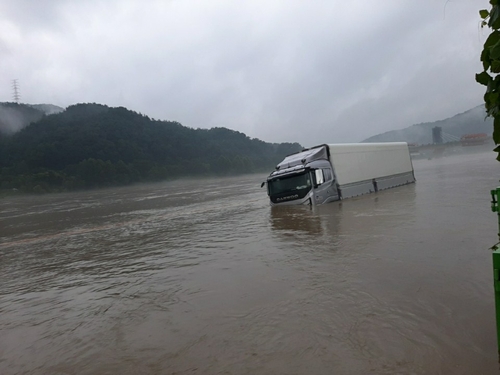 (세종=연합뉴스) 김준범 기자 = 11일 오전 5시 57분께 세종시 부강면 금호리 한 도로를 지나던 화물차가 폭우로 불어난 물에 잠겨 고립됐다.