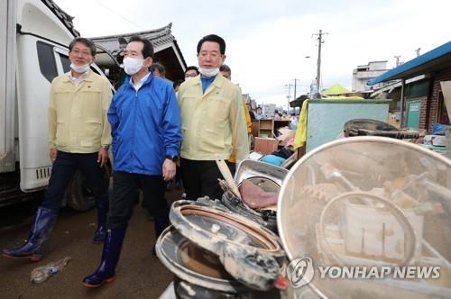 (구례=연합뉴스) 김주형 기자 = 정세균 국무총리(왼쪽 두 번째)가 집중호우 피해 현장 점검으로 10일 오후 전남 구례군 구례읍 구례 5일 시장을 찾아 침수 피해 및 복구상황을 둘러보며 무거운 표정을 하고 있다. 2020.8.10 kjhpress@yna.co.kr |