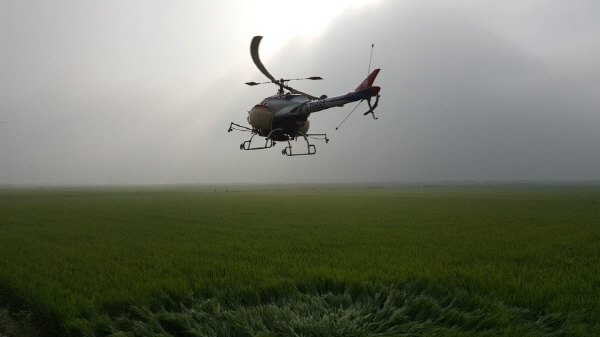 무인헬기로 병충해 항공 방제./사진제공=전남도. |