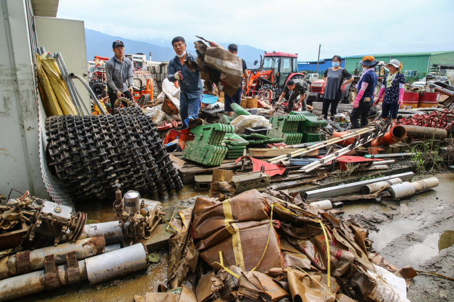 11일 전남 구례군 구례읍 농기계 대리점에서 물이 빠진후 흙탕물로 범벅인 자재들을 꺼내고 있다. /제공=구례군 |
