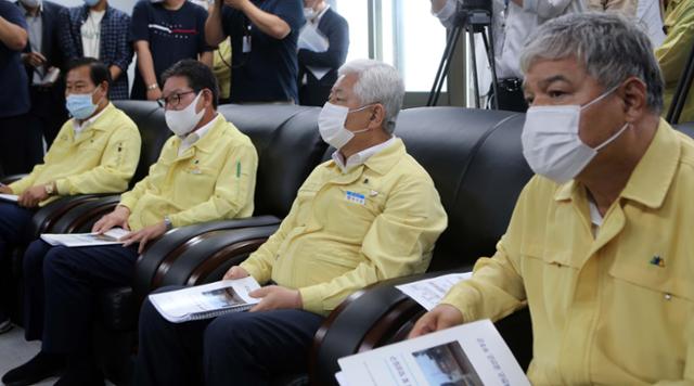 박세복 영동군수, 김재종 옥천군수, 문정우 금산군수, 황인홍 무주군수가 12일 대전 대덕구 한국수자원공사를 찾아 수위 조절 실패로 침수 피해가 발생했다며 수공의 책임을 주장하고 있다. 대전=연합뉴스 |