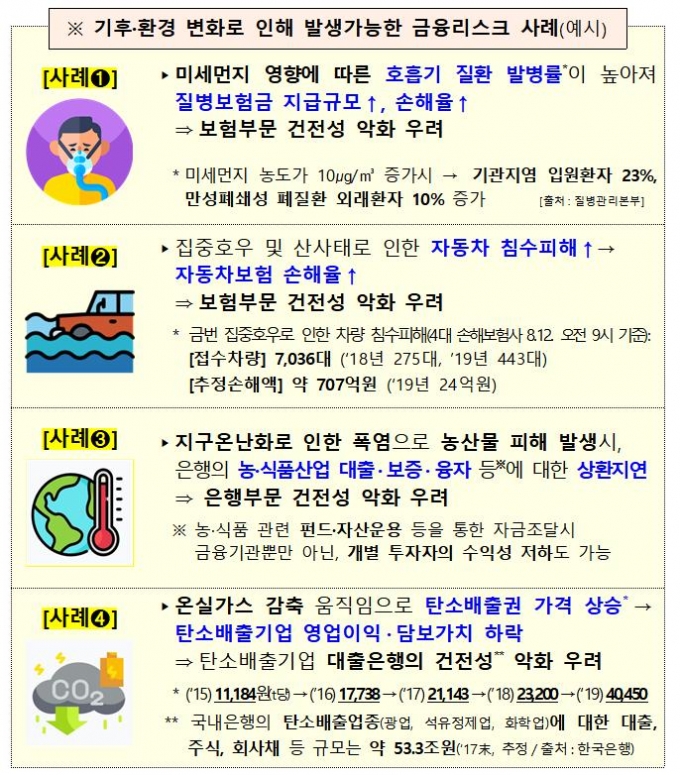 예컨대 최근 집중호우와 산사태로 자동차 침수피해가 속출하고 있다. 이는 곧 자동차보험 손해율을 높이는데 보험부문 건전성을 악화시킬 수 있다. 또 지구온난화에 따른 폭염은 농산물 피해로 이어지는데 농식품산업부문의 은행 대출이 부실해질 수 있다.