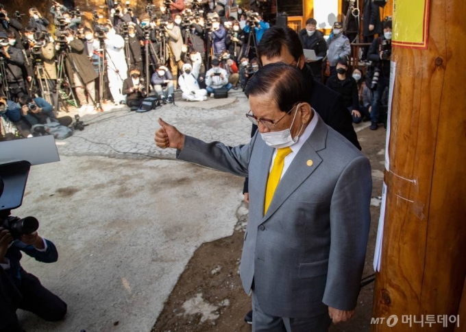 이만희 신천지예수교 증거장막성전(신천지) 총회장이 지난 3월2일 오후 경기도 가평군에 위치한 연수원 평화의 궁전에서 기자회견을 열고 공식입장을 발표했다. 이만희 총회장은 이날 기자회견에서 코로나19 확산 사태에 대해 두 차례 무릎을 꿇고 큰절을 하며 사과했다.회견을 마친 뒤 이어진 질의응답에서 '영생불사한다고 생각하느냐'는 질문을 받았으나 답변하지 않았고, 총 3개의 질문만 받고 퇴장해 취재진의 원성을 샀다.한편, 이만희 총회장의 손목에 박근혜 전 대통령 청와대 시절에 제작된 시계가 포착돼 화제가 됐다. / 사진=김휘선 기자 hwijpg@ |