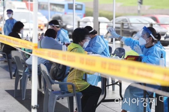 지난 10일 서울 남대문시장에 인근에 마련된 신종 코로나바이러스 감염증(코로나19) 선별진료소에서 인근 상인과 방문객들이 검체 검사를 받는 모습./문호남 기자 munonam@ |