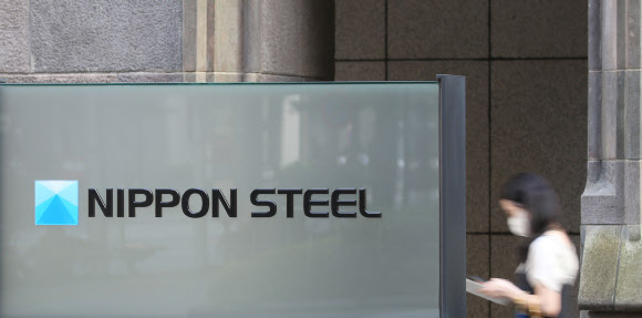 일본 도쿄도 지요다구 소재 일본제철 본사 앞에 설치된 안내판 근처에서 마스크를 쓴 여성이 이동하고 있다.(사진=연합뉴스) |