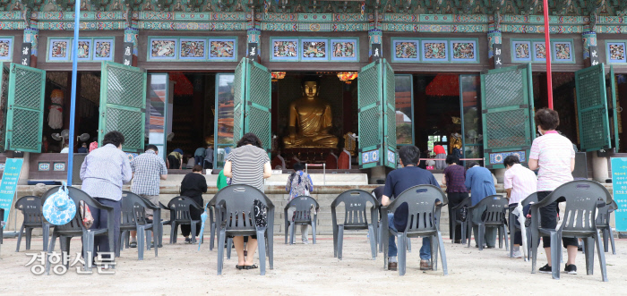 떨어져 앉은 조계사 신도들 국내 코로나19 신규 확진자가 279명을 기록한 16일 서울 종로구 조계사에서 신도들이 떨어져 앉아 법회에 참석하고 있다. 이날 일일 확진자 수는 지난 3월8일 이후 5개월여 만에 가장 큰 규모다. 권도현 기자 |
