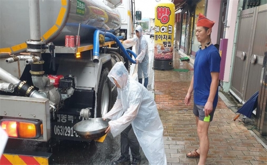 전남도와 5개 군이 한국수자원공사와 순천시의 협조를 얻어 집중호우로 단수된 지역민에게 비상급수차로 물을 지원하고 있다. |