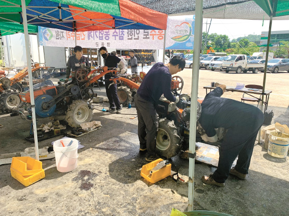 충북 영동군 농업기술센터가 호우와 용담댐 방류로 침수 피해를 본 농민들의 농기계를 긴급 수리하고 있다. 영동에서는 양산·양강·심천면 일원 9개 마을에서 트랙터와 경운기 등 80여 대가 수해를 입었다. 영동군 제공