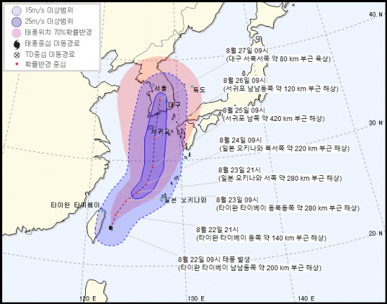 태풍의 다음주 중반 우리나라에 영향을 미칠 전망이다. 현재로썬 26일 오후나 밤사이 남해안에 상륙해 내륙을 지날 확률이 가장 높다. 27일 오전 8시 태풍은 대구 서북서쪽 약 80㎞ 육상에 위치할 것으로 기상청은 보고 있다.