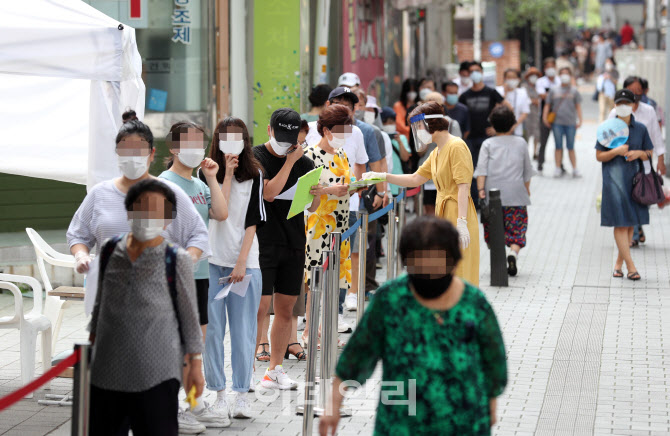 서울 성북구 사랑제일교회에서 코로나19 집단감염이 발생해 확진자가 급증한 17일 성북구보건소 선별진료소에서 시민들이 검사를 위해 줄지어 있다.(사진=노진환 기자) |