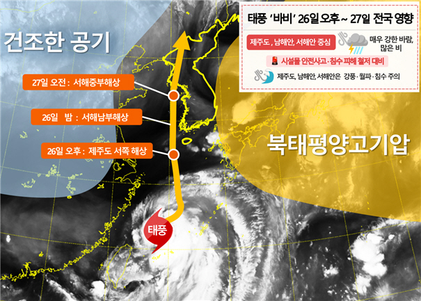 기상청에 따르면 태풍은 26일 오후 제주도 서쪽해상을 지나 밤에는 서해남부해상으로 이동하고, 27일 오전 서해중부해상까지 북상해 서울 등 수도권에 영향을 끼칠 전망이다. 27일 오후에는 북한 황해도 부근 연안으로 태풍이 상륙할 것으로 예상된다.