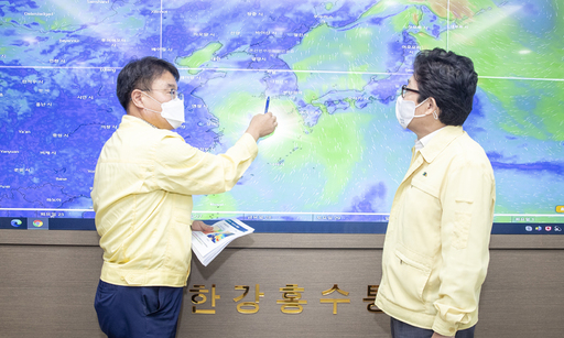조명래 환경부 장관이 23일 서울 서초구 한강홍수통제소에서 제8호 태풍 '바비' 북상에 따른 긴급 점검회의를 열고 태풍 상황 및 대응방안을 점검하고 있다. 환경부 제공 |