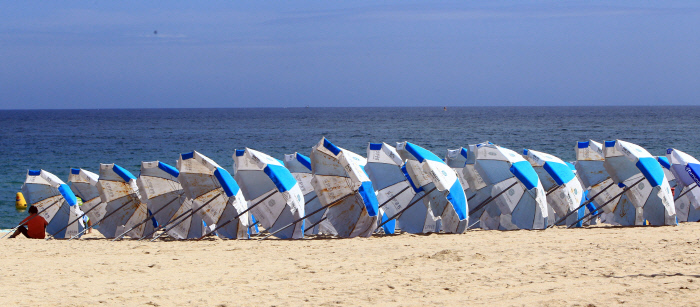 어느새 처서, 해수욕장 파라솔 ‘긴급 퇴거’ 정부의 물리적(사회적) 거리 두기 2단계 조치가 23일 전국으로 확대됐다. 긴급 폐장한 강릉 경포해수욕장 백사장에서 파라솔을 창고에 넣기 전 햇볕에 말리는 작업이 진행되고 있다. 연합뉴스 |
