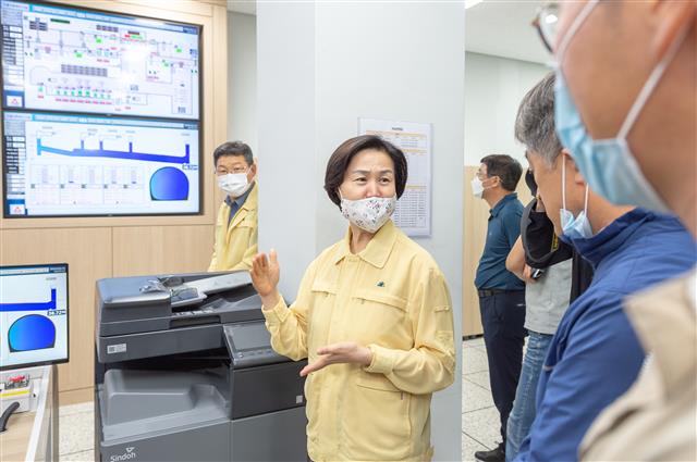 김수영(왼쪽 두 번째) 양천구청장이 지난달 24일 신월빗물저류배수시설의 목동 중앙제어실을 찾아 장마철 대비 배수 시설을 점검하고 있다.양천구 제공 |