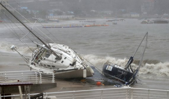 작년 제17호 태풍 '타파(TAPAH)'가 북상하며 울산지역에 태풍경보가 발효된 가운데, 오후 울산시 동구 일산해수욕장 백사장에 요트 2척이 좌초돼 있다. 뉴스1 |