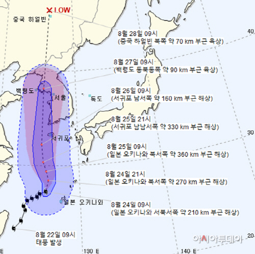 아시아투데이 이주형 기자 = 제8호 태풍 ‘바비’가 북상하면서 25일 밤부터 제주도를 시작으로 우리나라도 본격적으로 영향권에 들 전망이다. 특히 태풍의 강도가 25~26일 강해질 것으로 예보됨에 따라 큰 피해가 예상된다.