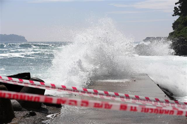제8호 태풍 ‘바비(BAVI)’가 북상 중인 24일 오후 제주 서귀포항 방파제 인근에 거친 파도가 치고 있다. 제주는 이날 밤부터 태풍 간접영향권에 들 것으로 보인다.2020.8.22뉴스1 |