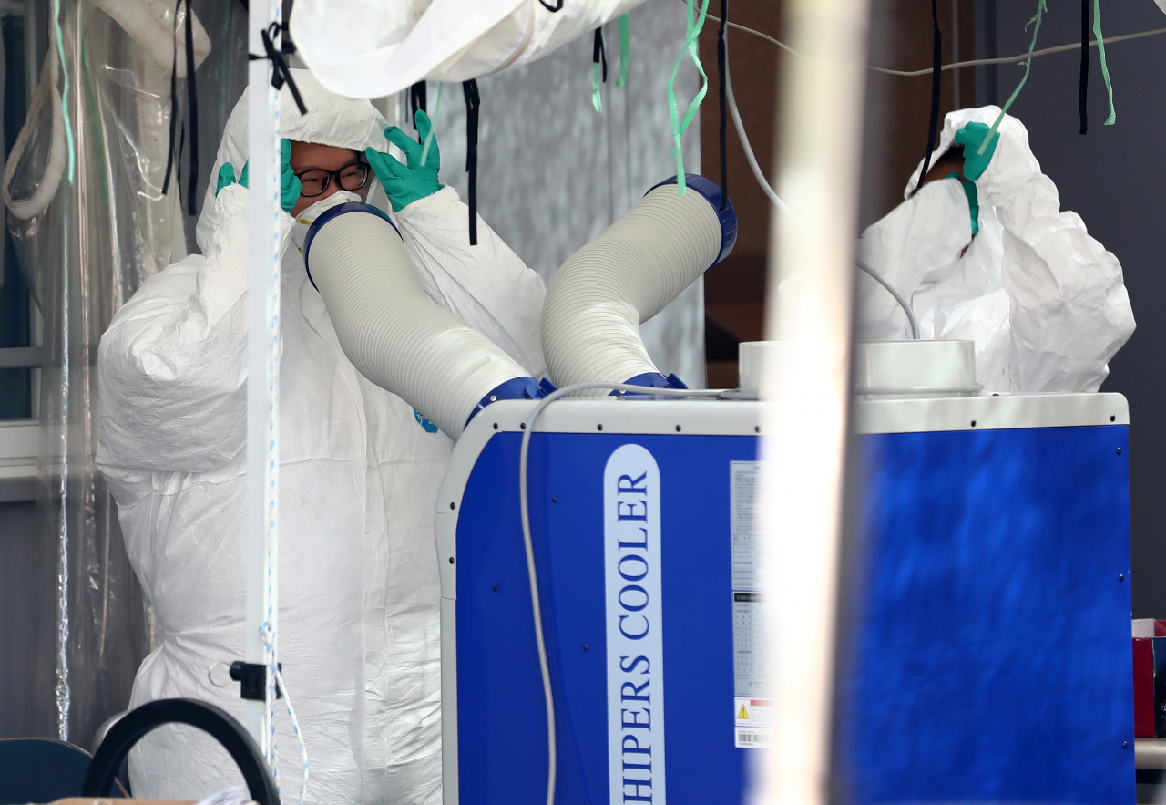 신종 코로나바이러스 감염증(코로나19) 확산세가 이어진 지난 24일 오전 대전 서구 만년동 서구보건소 선별진료소에서 의료진이 더위를 식히고 있다. [연합] |