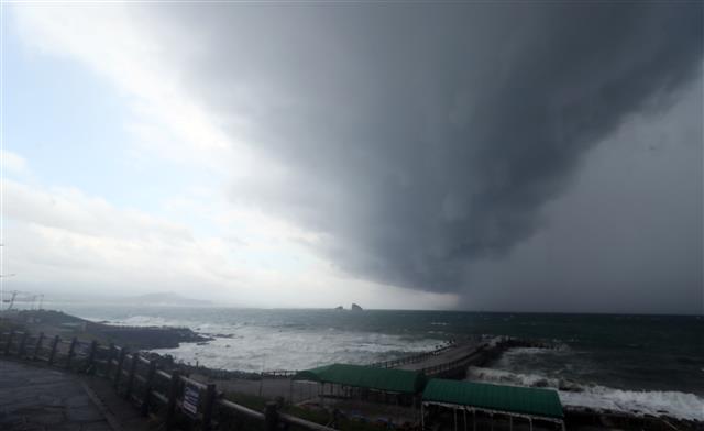 ‘태풍 바비’ 제주 덮치는 거대 먹구름 - 제8호 태풍 ‘바비(BAVI)’가 북상 중인 25일 오후 제주 서귀포시 대정읍 송악산 인근 해상에 먹구름이 몰려오고 있다.제주지방기상청은 25일 낮 12시를 기해 제주도 남쪽 먼 바다에 내려져 있던 태풍주의보를 태풍경보로 격상했다.2020.8.25/뉴스1 |