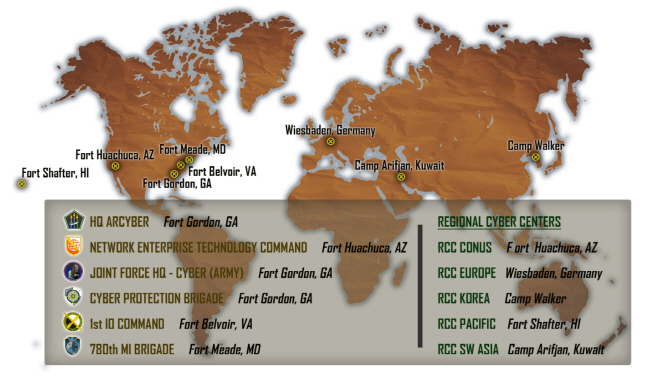 미국 육군 사이버사령부는 25일(현지시간) 북한을 중국·러시아·이란·테러리스트와 함께 미국에 대한 사이버 위협 국가라고 규정했다. 사진은 전 세계의 미 사이버부대 분포도. 한국에는 대구 미군기지인 캠프 워커가 표시돼 있다./사진=미 사이버사령부 홈페이지 캡처 |