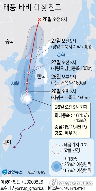 바비는 낮 동안 매우 강한 태풍 수준을 유지하며 제주도 서쪽 대략 130㎞ 해상을 지나고 오후에 수온이 다소 낮은 서해상에 진입할 예정이다
