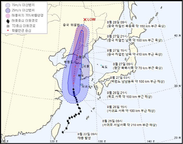 경기 서해안에 영향을 준 뒤 오는 27일 새벽 북한 황해도에 상륙할 전망이다.