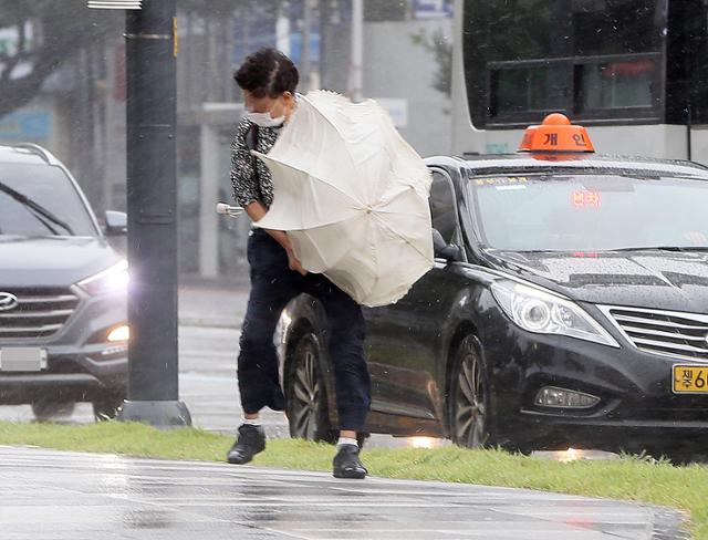 북상하는 제8호 태풍 '바비'의 직접 영향권에 접어든 26일 오전 제주시 내 거리에서 강한 비바람에 사람들이 힘겹게 걸어가고 있다. 연합뉴스 |