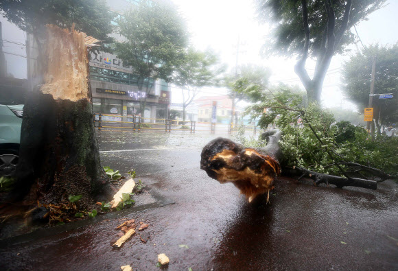 북상하는 제8호 태풍 ‘바비’의 영향으로 26일 오전 제주시 오라일동 오남로 거리에 있는 가로수가 두동강 난 채 쓰러져 있다. 2020.8.26. 연합뉴스 |