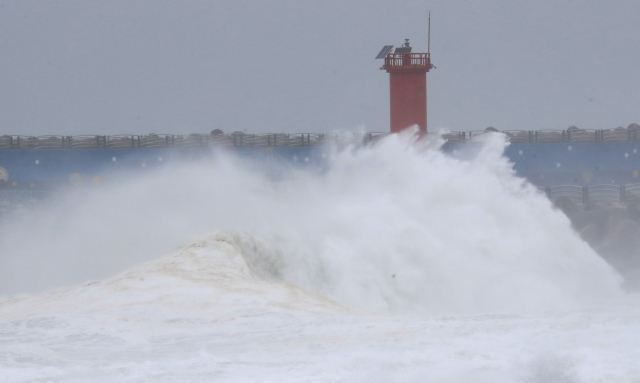 제주도가 제8호 태풍 '바비'의 직접 영향권에 들어간 26일 오전 제주 서귀포시 대정읍 모슬포항 방파제에 강한 파도가 몰아치고 있다. [연합] |