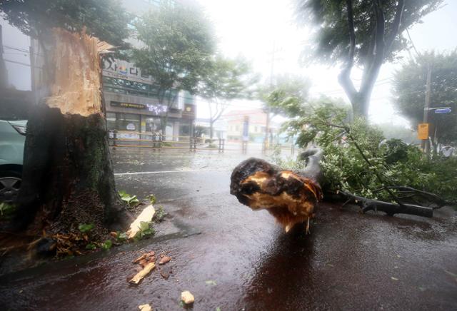 북상하는 제8호 태풍 '바비'의 영향으로 26일 오전 제주시 오라일동 오남로 거리에 있는 가로수가 두동강 난 채 쓰러져 있다. 연합뉴스 |