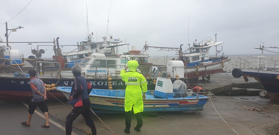 27일 오전 태풍 바비가 통과한 홍성 남당항에서 어민들이 선박 피해 상황을 살피고 있다. 홍성군 제공 |