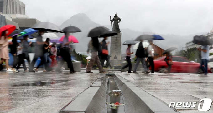 제8호 태풍 '바비'의 영향으로 비가 내린 27일 오전 서울 세종대로 광화문광장 인근에서 우산을 쓴 시민들이 출근길 발걸음을 재촉하고 있다. 2020.8.27/사진 = 뉴스 1 |