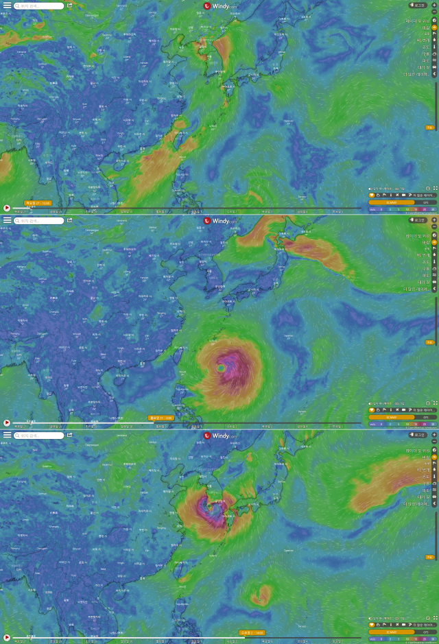 체코 기상앱 ‘윈디’가 예측한 제9호 태풍 ‘마이삭’의 예상 경로. 위에서부터 27일 낮 12시, 31일 0시, 9월 2일 오후 2시 예보. 사진=윈디 갈무리 |