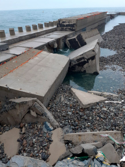 처참히 파손된 가거도 방파제 - 강풍을 동반한 제8호 태풍 ‘바비’가 지나간 27일 전남 신안군 흑산면 가거도항 방파제가 처참하게 파손돼 있다. 공사 중인 방파제가 강풍과 함께 밀어닥친 거센 파도를 견디지 못하고 힘없이 유실됐다.신안 연합뉴스 |