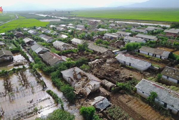 황해북도 은파군 대청리 수해 현장. 집 지붕이 무너져 내리거나 침수된 모습이다. <조선중앙텔레비전> 화면 갈무리, 연합뉴스 |