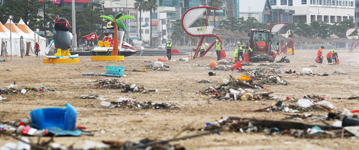 27일 오전 부산 광안리해수욕장에서 제8호 태풍 '바비'로 인해 백사장으로 밀려온 해초, 플라스틱, 폐어망 등을 수영구청 직원과 119민간수상구조대가 치우고 있다. 태풍 '바비'는 이날 오후 3시 소멸했지만, 제9호 태풍 '마이삭'이 다음 달 2일쯤 한국을 통과할 것으로 전망된다.