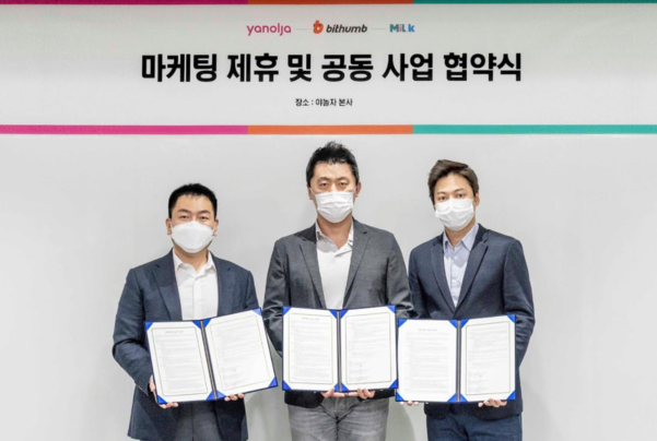 야놀자는 전날 서울 강남구 본사에서 3사 간 협약식을 진행했다. 이번 행사에는 김종윤 야놀자 온라인 부문 대표, 허백영 빗썸 대표, 조정민 밀크파트너스 대표가 참석했다.