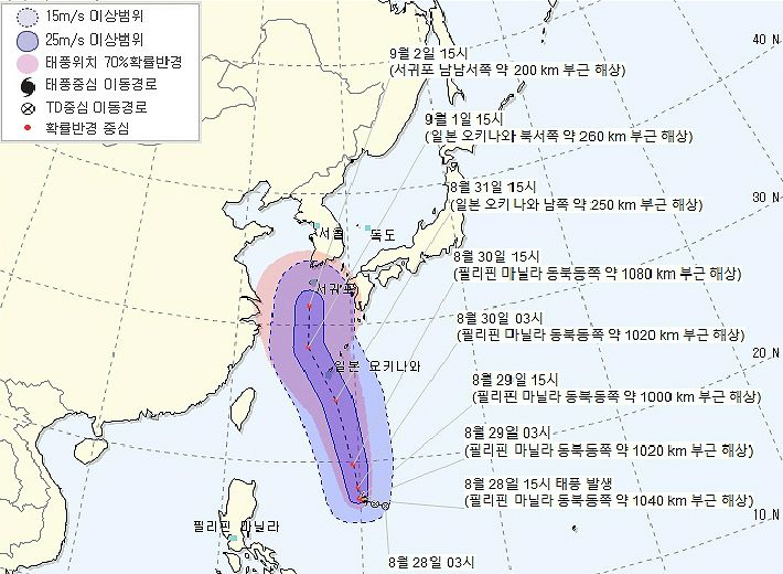 기상청 관계자는 "9월2일 오후 3시쯤 서귀포 남남서쪽 약 200㎞ 부근 해상에 도달할 것으로 전망된다"며 "사전 대비에 유념해야 한다"고 밝혔다.