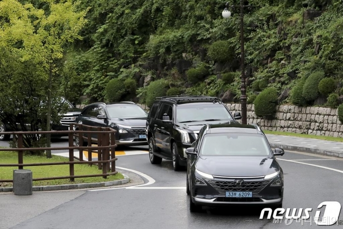 문재인 대통령이 10일 대통령 전용차로 도입된 수소차(넥쏘)를 탑승해 서울 성북구 한국과학기술연구원에 도착하고 있다. (청와대 제공) 2019.9.10/뉴스1 |
