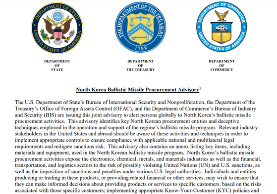 미국 국무부 국제안보비확산국(ISN)과 재무부 해외자산통제국(OFAC), 상무부 산업안보국은 공동명의로 북한의 탄도미사일 관련 활동에 대한 주의보를 내놨습니다.