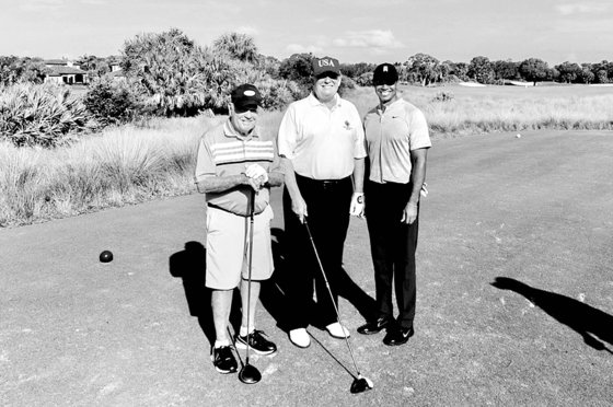 도널드 트럼프 미국 대통령이 지난해 2월 2일 미국 플로리다의 트럼프 내셔널 골프클럽에서 잭 니클라우스(왼쪽), 타이거 우즈와 함께 골프 라운딩을 돈 뒤 기념사진을 찍고 있다. 트럼프는 이 사진을 자신의 트윗에 게재했다. [UPI=연합뉴스] |