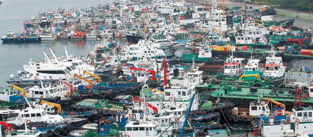 울산 장생포항에 긴급대피한 선박들 6일 북상 중인 제10호 태풍 하이선을 피해 울산 남구 장생포항에 어선과 여객선 등의 선박들이 정박해 있다. 하이선의 영향으로 7일 전국적으로 50∼400mm의 비가 내리고 바다 물결도 12m까지 오를 것으로 전망된다. 울산=뉴스1 |