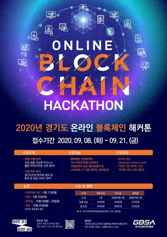[아시아경제(수원)=이영규 기자] 경기도경제과학진흥원이 오는 21일까지 '2020 경기도 온라인 블록체인 해커톤(Hackathon)대회' 참가팀을 모집한다.