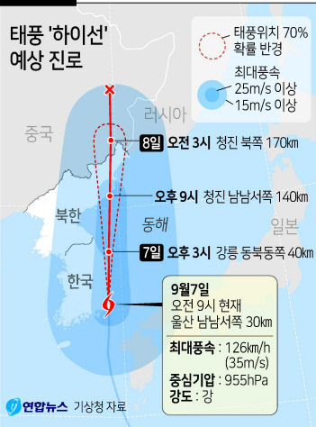 하이선은 이날 오후 3시께 강릉 동북동쪽 약 40㎞ 부근 해상을 지나 오후 9시께 함경북도 청진 남남서쪽 약 140㎞ 부근 해상을 거쳐 8일 오전 3시께 청진 북쪽 약 170㎞ 부근 육상에 상륙할 것으로 전망된다.