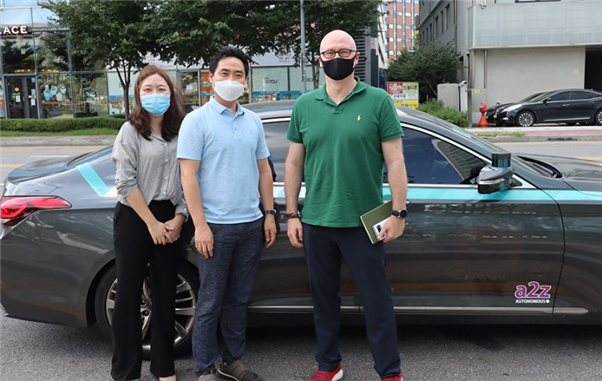 글로벌 에이전트들과 A2Z 자율주행 차량 도심 실도로 시승 후 한지형 대표(가운데)(사진제공=오토노머스에이투지) |