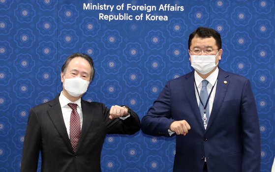 최종건 외교부 1차관(오른쪽)이 7일 서울 종로구 외교부 청사에서 도미타 고지(富田浩司) 주한 일본 대사를 만나 기념 촬영을 하고 있다. 연합뉴스 |