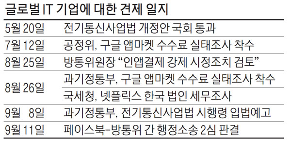 최근 구글, 넷플릭스, 페이스북 등 글로벌 정보기술(IT) 기업들에 대한 한국 정부의 공세가 심상치 않다. '글로벌 기업들에 행정력이 제대로 미치지 못한다' '국내외 기업 간 역차별'이라는 지적이 잇따르자 고삐를 바짝 죄는 모습이다.