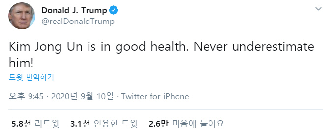 도널드 트럼프 미국 대통령은 10일(현지시간) “김정은은 건강하다. 절대 그를 과소평가하지 마라”는 트윗을 올렸다.